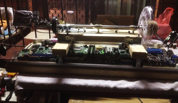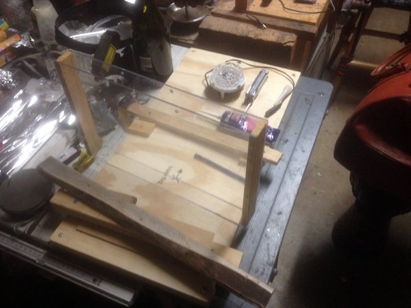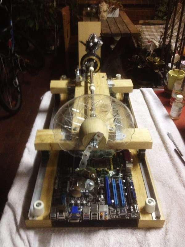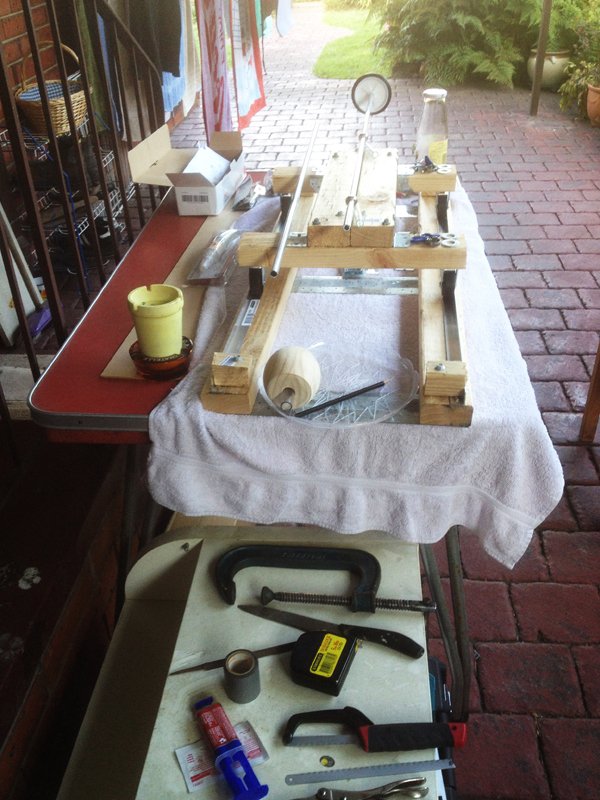 BUILD MM was built on a pine wood frame held together by metal strips. Dolly uses trolley wheels guided by aluminium strips. Camera axle is aluminium held in rotational position by eyelets screwed into wooden frame. Photo by Adem J |