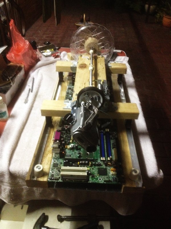 BUILD Camera affixed to axle using a bookshelf bracket customised to hold camera so that lens is centred to axle whilst spinning. Video signal passed through trolley wheel using a brass car horn ring for infinite spin. Car cigarette lighter charger device with spring loaded contact point applied to ring to ensure signal contact even if spin wobble occurs. Photo by Adem J |