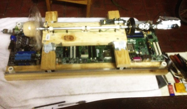 BUILD Crank handle and counterweights added to door knob to give another option for spinning camera and balancing centrifugal force. Scrap circuit board added to base for aesthetic reasons. Photo by Adem J |