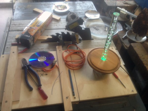 BUILD Here the axle is braced in place, earthing of video signal applied to axle. A wooden door knob fixed to a baklava plate enables a grip to spin and geometric shapes to align. Photo by Adem J |