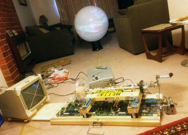 METTA MACHINE v2.0The Metta Machine DIY device was born out of many years of experimenting with video feedback. After building the REALITY MACHINE v1.0 prototype the natural progression was to upscale to a full size camera. The impetus to build this device came about when Ollie O (from TTG) asked to do some video feedback for their live shows in 2015. Not wanting to use hand held feedback because of some of its limitations, it was decided that it was time to build... it... So 2 weeks, $300 dollars, many back n forth visits to Bunnings, Jaycar and Spotlight and many many sleepless nights later... Its aliiive.. The Metta Machine gives precise control of video feedback, enabling the camera position to remain static if need be, freeing up the hands to affect the image feedback pathway - limited only by the imagination. Must also thank my neighbour old school electronics tech Chris H for his elegant solution for passing earth through alloy chassis rather than an over complex copper ring solution. And a big thanks my seamstress neighbour Nimpha for (solutions for) sowing together both screen. |